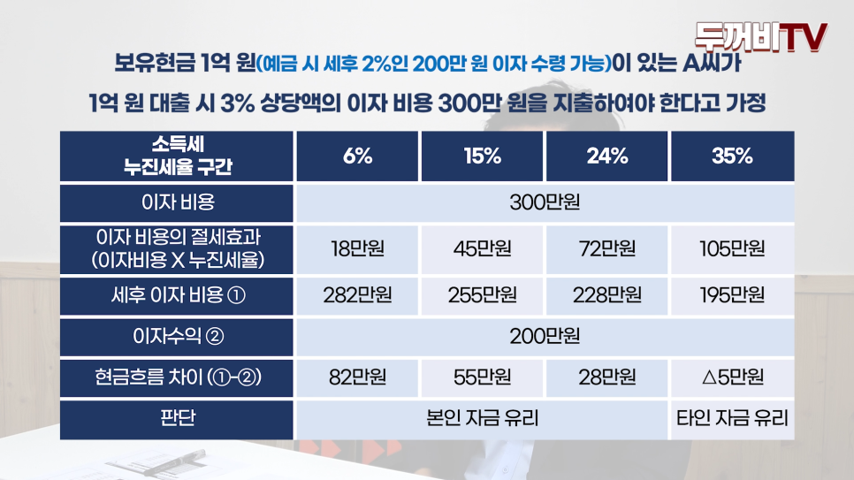결국 A 씨의 소득세 누진세율 구간이 35% 이상이라면 본인 자금으로 이를 지출하기보다는 대출 등 타인의 자금을 빌려 내는 것이 더 유리할 것이란 뜻이죠.