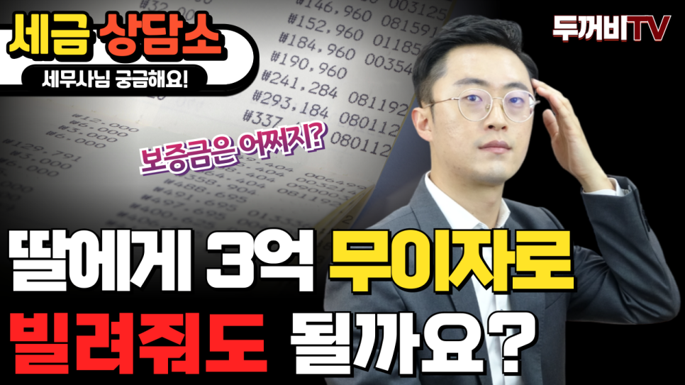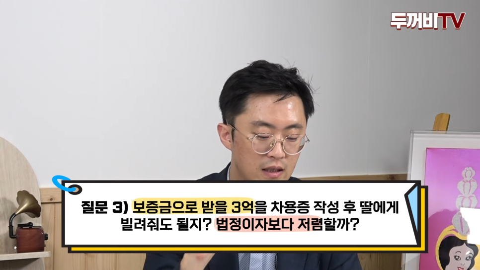 마지막 질문으로 보증금으로 받을 3억원을 차용증을 작성하고 딸에게 빌려줘도 될지, 법정이자보다 저렴하게 빌려줘도 괜찮을지 물어보셨는데요.